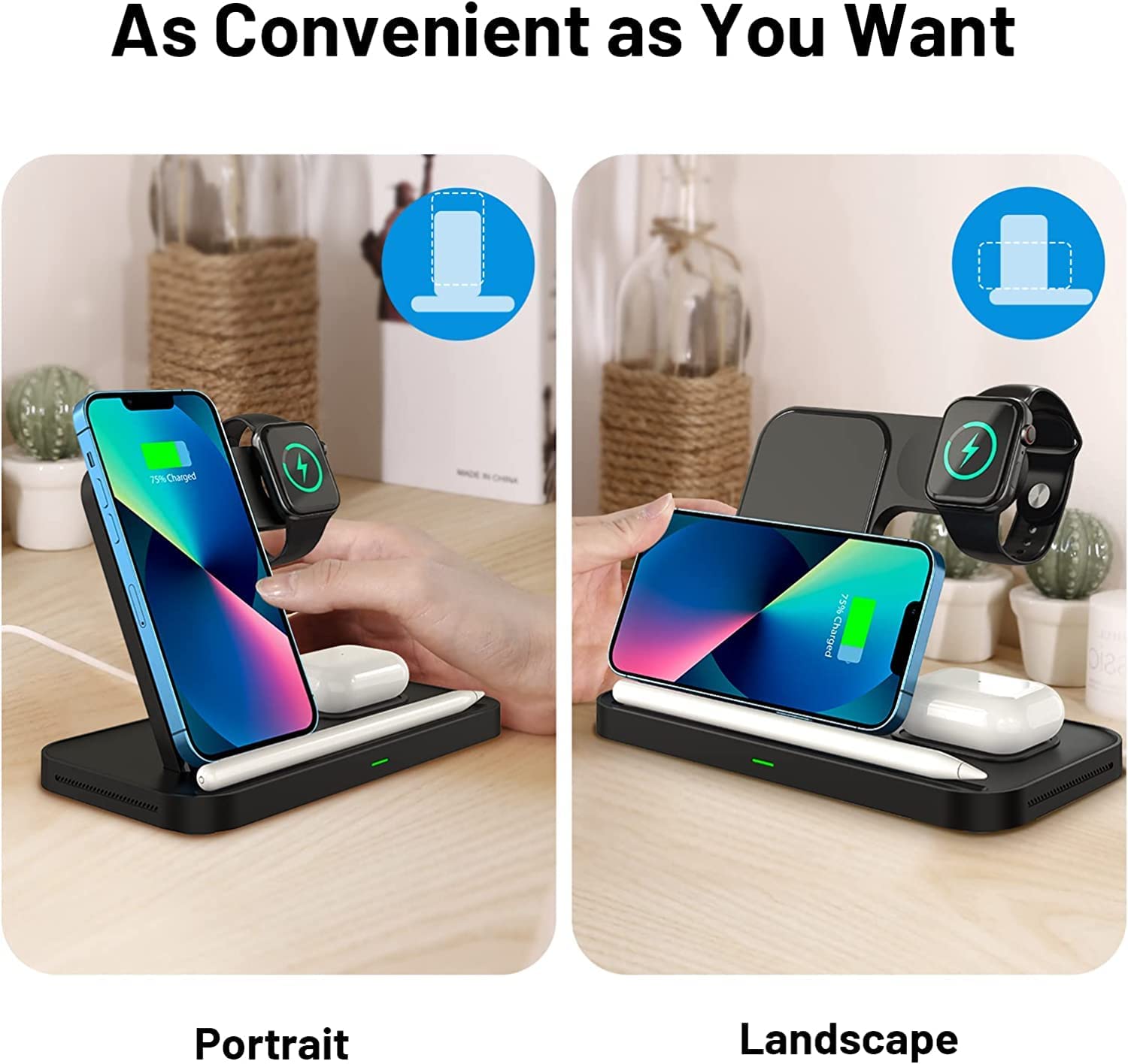 To assure your charging safety, the induction charging station uses the most sophisticated smart chip technology, with over-current protection, over-voltage protection, and over-temperature protection capabilities. To charge the watch, there are two distinct interfaces in the location of the dock; simply choose the proper interface and insert it.